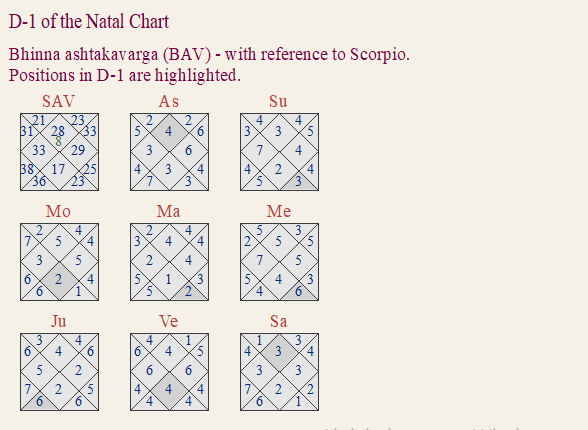 Ketu i Rahu Leu prelaze malta ne drito preko stupnjeva podznaka, a u razdoblju je Jupitera/Venere/Rahua. Jupiter je trenutno retrogradan, ali u za njega jakoj kući kod Lea – obratite pozornost na ˝ashtakavarga˝ bodove za Jupitera i znak Vodenjaka (slika iznad). Istovremeno, znak Bika mu je katastrofalno slab iako ima tamo Veneru i Mjesec u svojim znakovima. Rahu je ˝pod palicom˝ Venere jer je u njezinom znaku no donio je lošija obilježja sedme kuće (ugovor, odnosi, karijera) s obzirom na slabost znaka Bika. Jupiter je jak, ali retro pa donosi elemente zbunjenosti i svojstva su mu izokrenuta; njegova snaga se ipak očituje u povoljnom kontekstu kao što ćemo vidjeti u nastavku članka.
